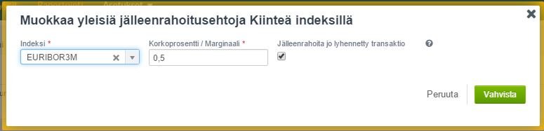 Lisääminen tapahtuu valitsemalla oletuksena käytettävä viitekorko sekä lisäämällä arvio marginaalista, jolla jälleenrahoitus toteutuu. Lainasalkun sisältäessä tasalyhenteisiä lainoja, merkitään myös rasti kohtaan Jälleenrahoita jo lyhennetty transaktio.
