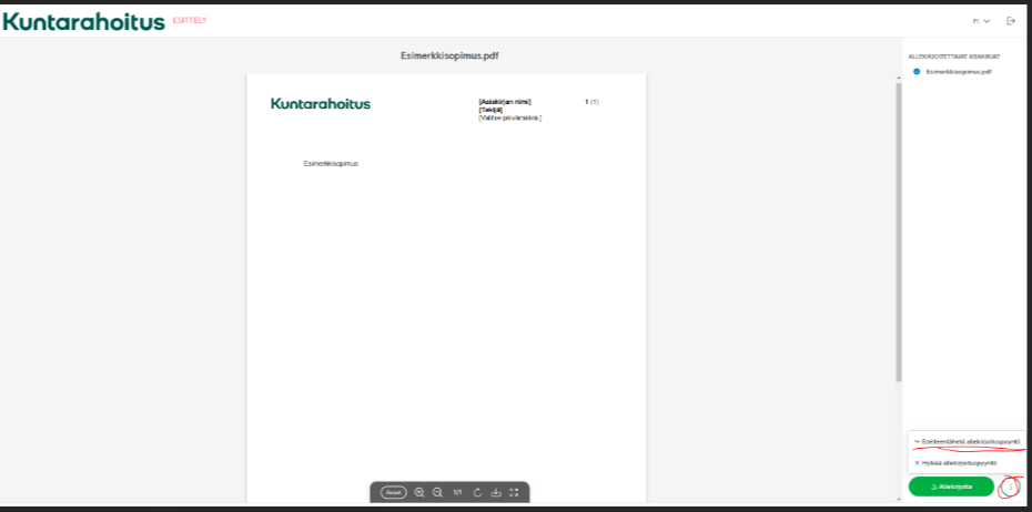 Mikäli allekirjoittajana toimii joku toinen henkilö, voit edelleenlähettää allekirjoituspyynnön avatulta allekirjoituspyynnöltä. Kun sopimukset aukeavat, löytyy oikealta kolme pistettä, josta voi valita vaihtoehdoksi "Hylkää allekirjoitus" tai "Edelleenlähetä allekirjoituspyyntö".