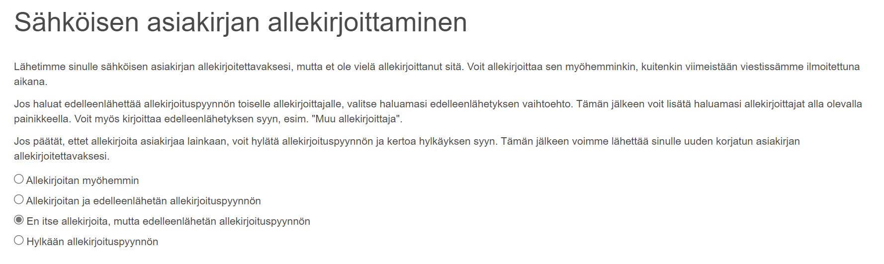 Allekirjoituspyynnön voi sulkea ja siihen voi palata myöhemmin, jolloin näkymä hieman muuttuu. Edelleenlähettäminen on kuitenkin vielä mahdollista. Uuden allekirjoittajan yhteystiedot ovat ilmoitettava ja vapaaehtoisesti voi myös ilmoittaa edelleenlähetyksen syyn.
